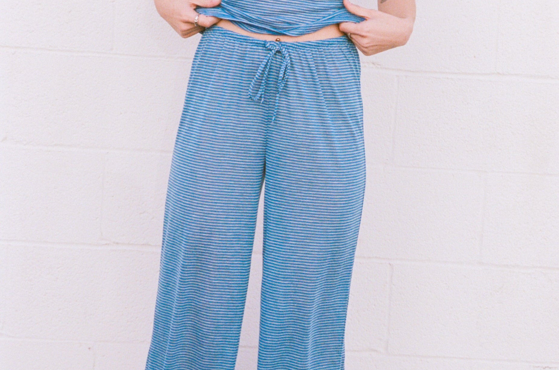Our Drawstring Lounge Pant is an effortless staple perfect for lounging, slow mornings, or easy everyday wear. Made in Los Angeles from an ultralight, soft, slightly sheer deadstock stripe blend, this breathable fabric feels airy and barely there, making it ideal for all-day comfort. They feature a relaxed, baggy fit with a full-length hem and adjustable drawstring waist for an easy, laid-back silhouette. Pair them with our 3/4 Sleeve Top for a matching, lounge-all-day look.
