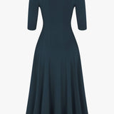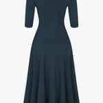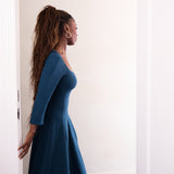 The deep square scoop neckline flatters the collarbone, while sizes 2X and 3X have a slightly higher cut for added support without altering the shape. Fitted through the bust and ribcage, it flares gently from the waist for a feminine drape that falls just below the calf. Supportive, curve-hugging, and maternity-friendly, it’s a versatile piece that transitions seamlessly from day to night.