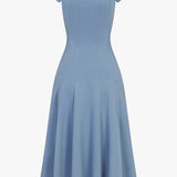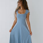 It hugs through the bust and ribcage, then flares gently from the waist for a feminine drape that hits just below the calf. Supportive, curve-hugging, and maternity-friendly, this piece can be dressed up or down depending on the occasion.