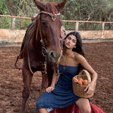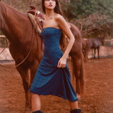 A feminine strapless dress featuring an A-line, mid-length skirt that moves effortlessly with you. The bust features a built-in shelf bra for added coverage and comfort, with a charming keyhole detail for a hint of playful charm. Delicate lace trim and a satin bow add a soft, romantic touch, and the look is finished with a ruffled hem for the perfect flutter.