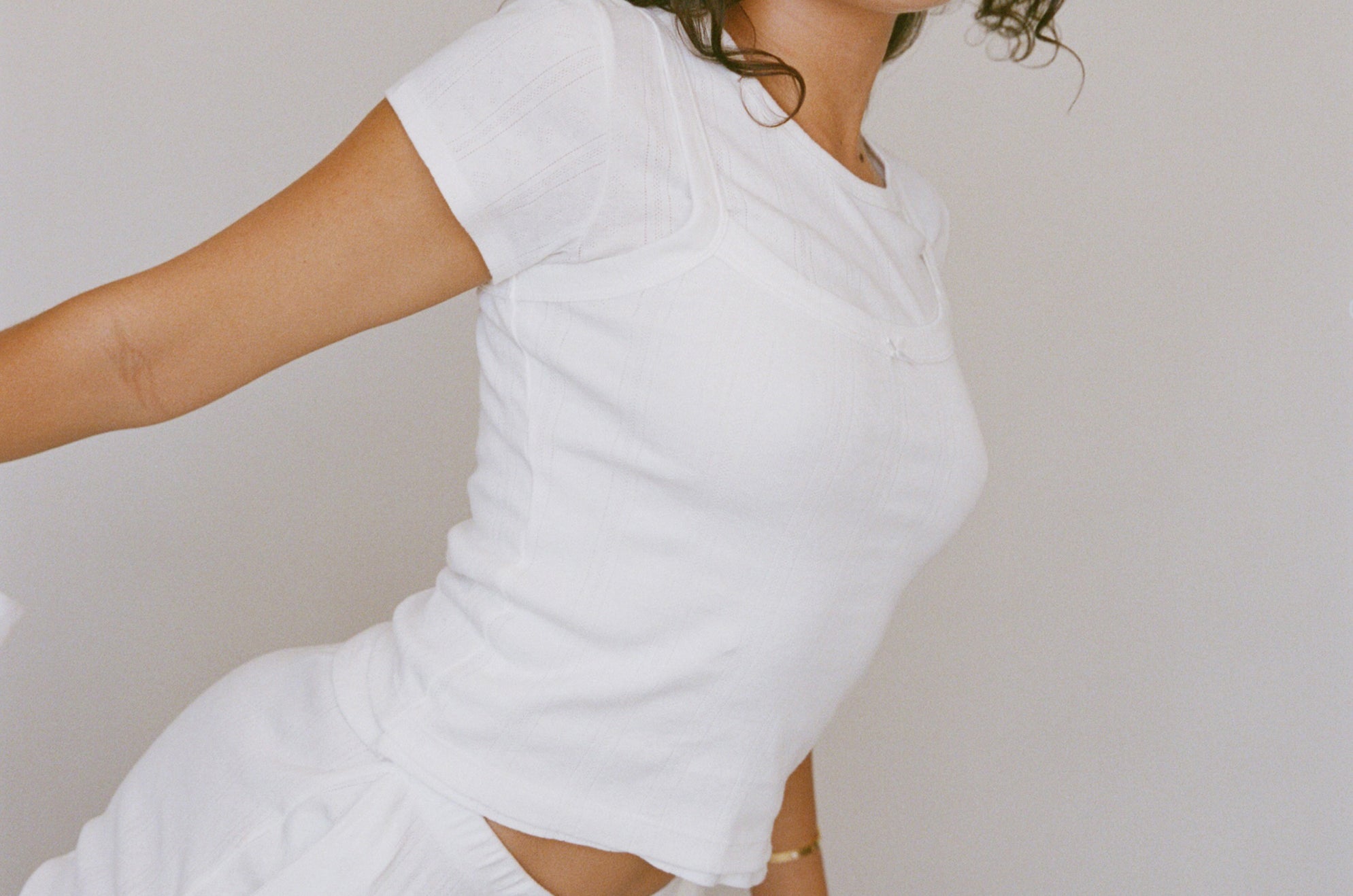 Meet the Perfect T-shirt—slightly fitted, mid-length, and designed to hug you in all the right places. It’s soft, breathable, and hits just above the hips for a flattering everyday fit. Made in our breezy pointelle, which is knit and sewn in LA and our signature cotton jersey, it’s an easy essential you’ll want to wear on repeat. Pair it with your favorite denim for an effortless, put-together look. Please note that the Swan color way is more sheer than the other color ways.