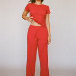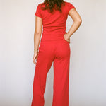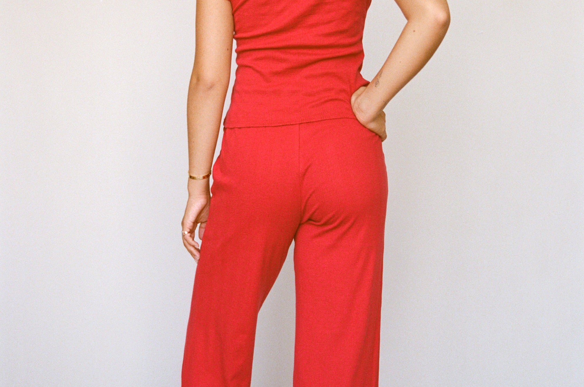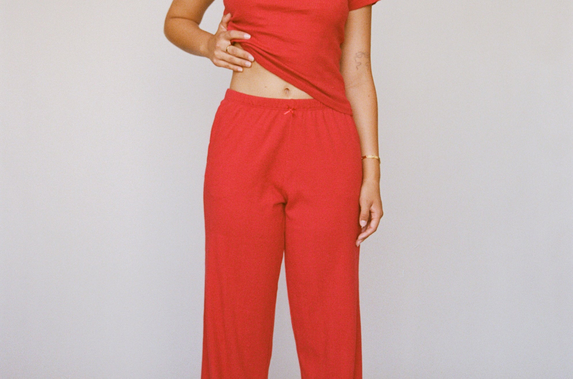 A high rise lounge pant made from 100% organic cotton pointelle with a soft breathable feel. Knitted and sewn in Los Angeles for a fully LA-made piece. Designed with a full length leg and a slightly flared opening for an easy drape. Cut with a flattering tailored shape that feels polished enough to wear out yet relaxed enough for home. Finished with side pockets for everyday ease. Please note: the Swan color way is slightly sheer.
