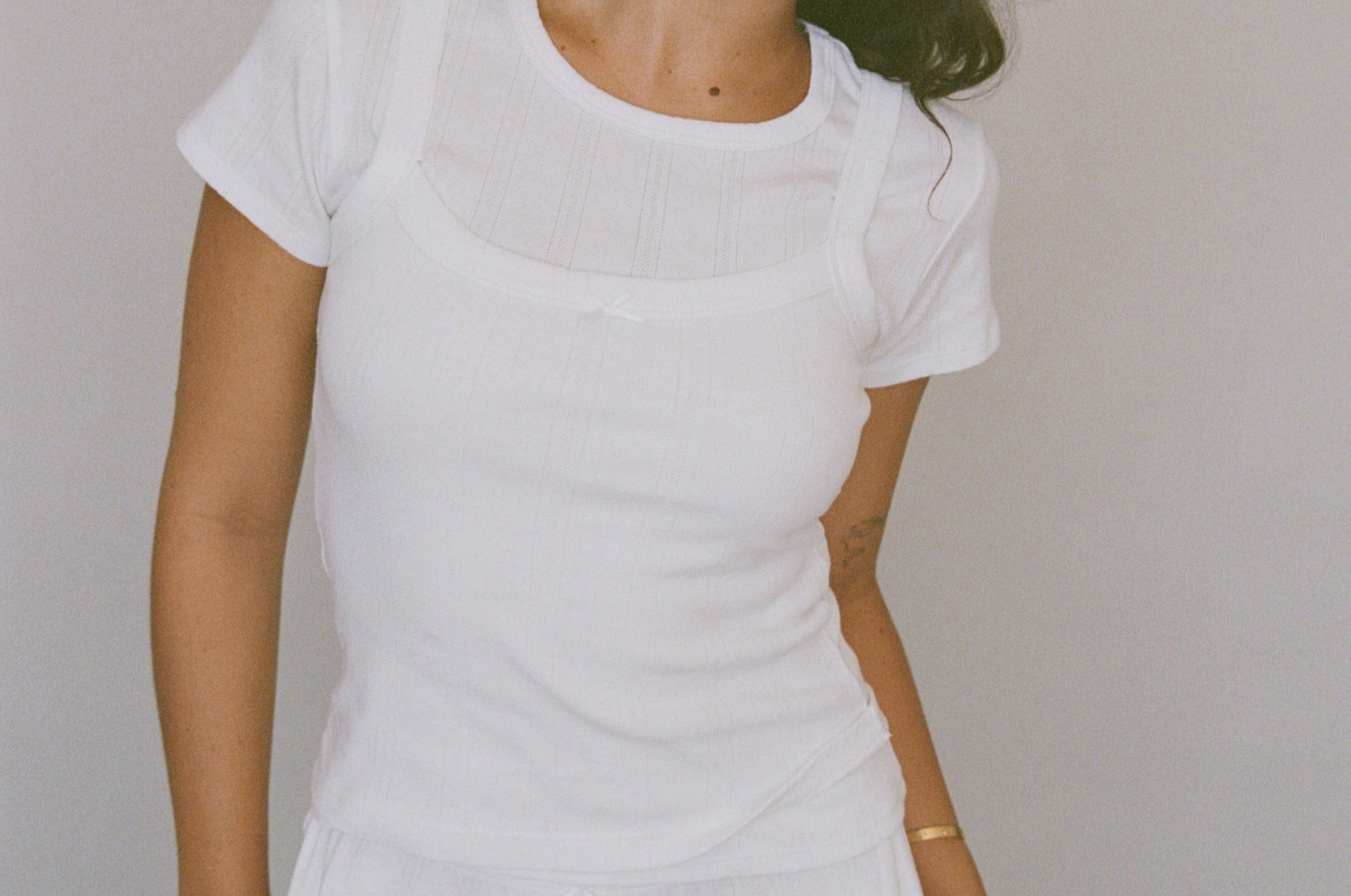 Our square neck camisole is crafted from breathable organic cotton knit with delicate pointelle detailing, inspired by vintage menswear and woven in Los Angeles. It features a snug fit, medium length hem, a square neckline in both the front and back, and a bra-friendly design. A satin bow at the center front adds a sweet touch. Pair it with our matching pointelle cardigan or easy pants for a cozy set. Please note that the Swan color way is slightly sheer.